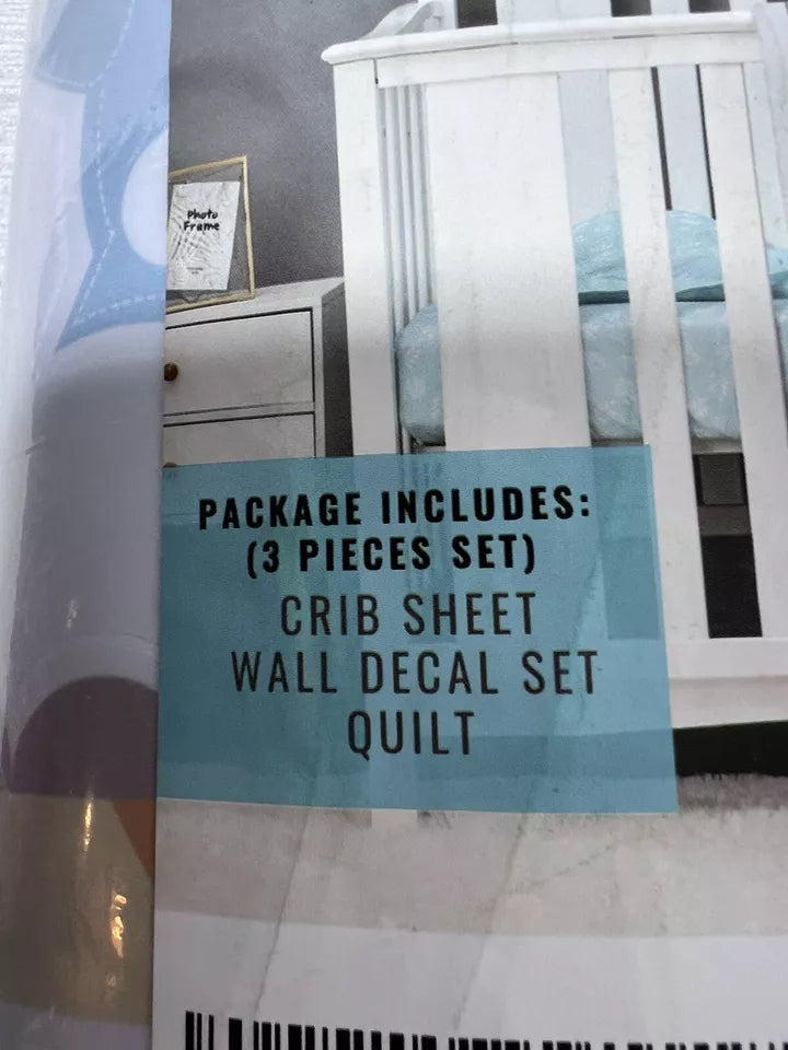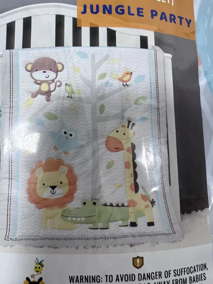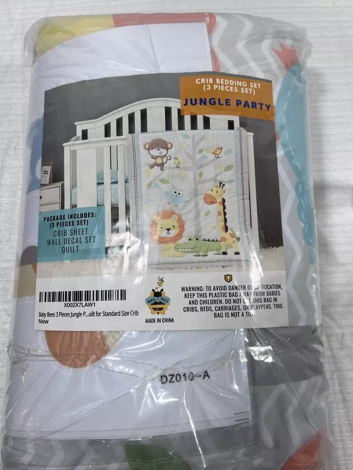 Create a charming nursery with the Baby Bees 3 Piece Crib Bedding Set Jungle Party. This set includes a soft crib sheet, adorable wall decal set, and cozy quilt, perfect for welcoming your little one into a playful jungle-themed space.