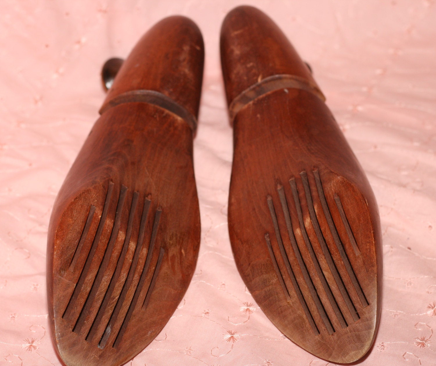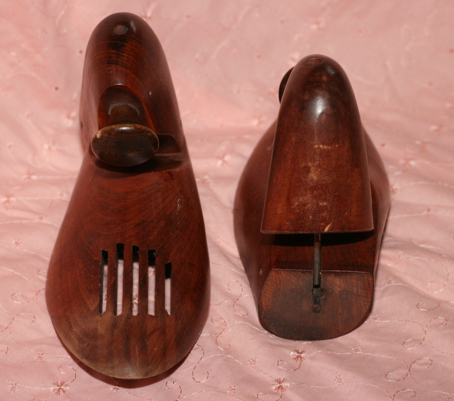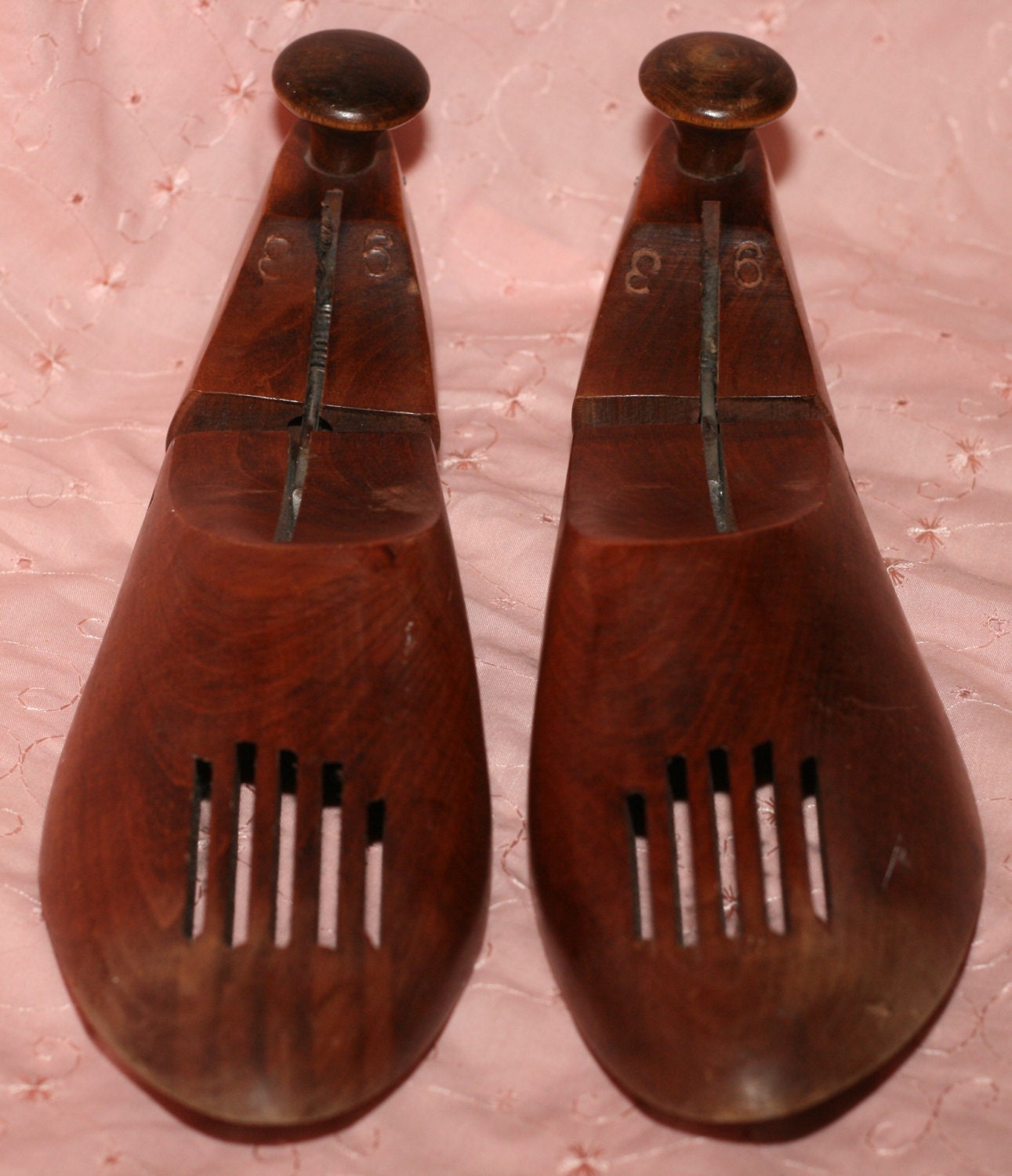 This pair of shoe forms are in really good condition. There is a little wear, but overall, they don't have many scuffs. The knobs are both in tact and the hinges are still good and strong. They have the numbers 9 and 3 on the top near the knobs. The shoe forms measure about 12" long x 3.5" wide at the widest point and 3" tall at the knobs.