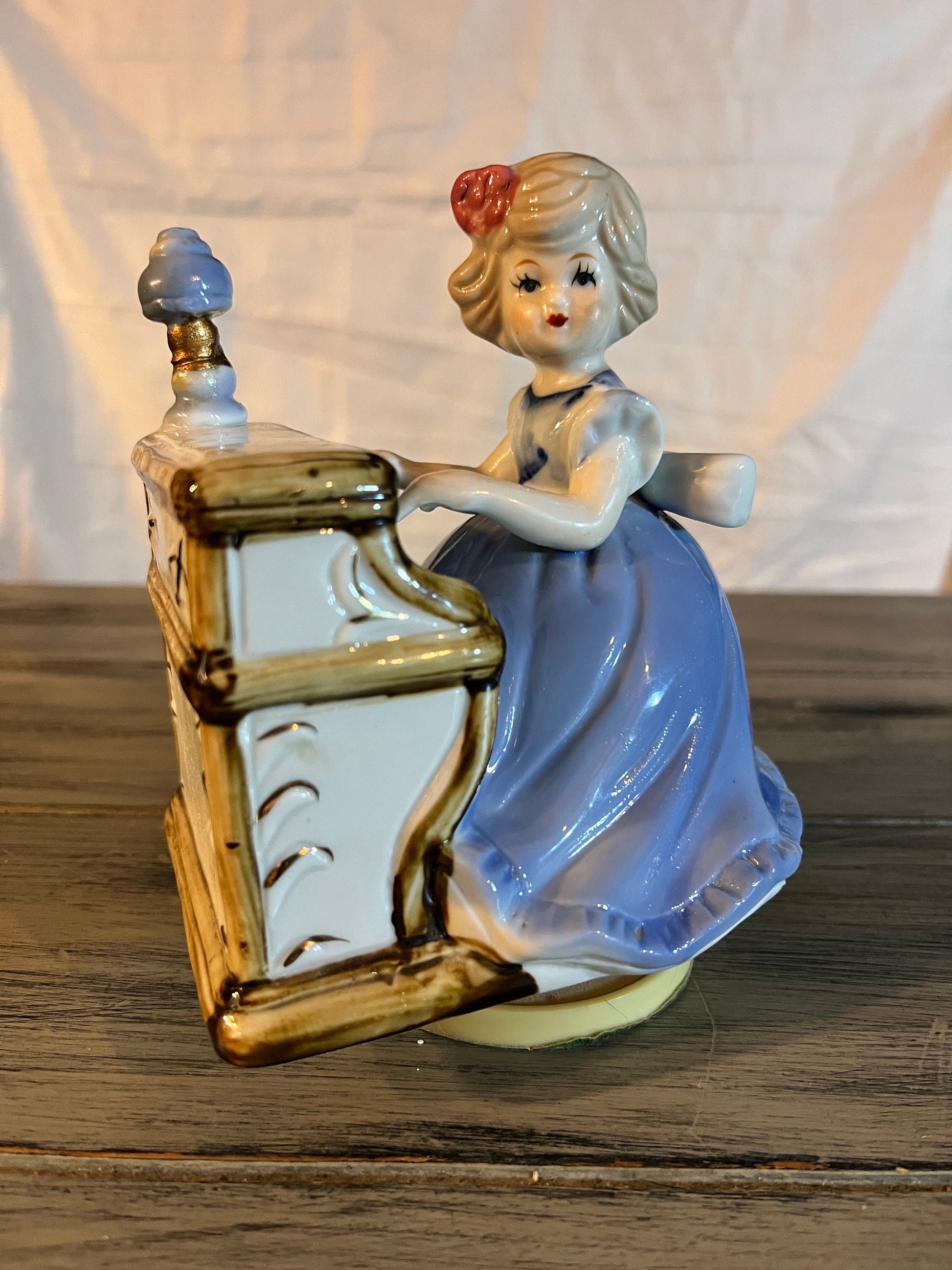 - **Figurine**: Blonde girl in blue dress playing a piano